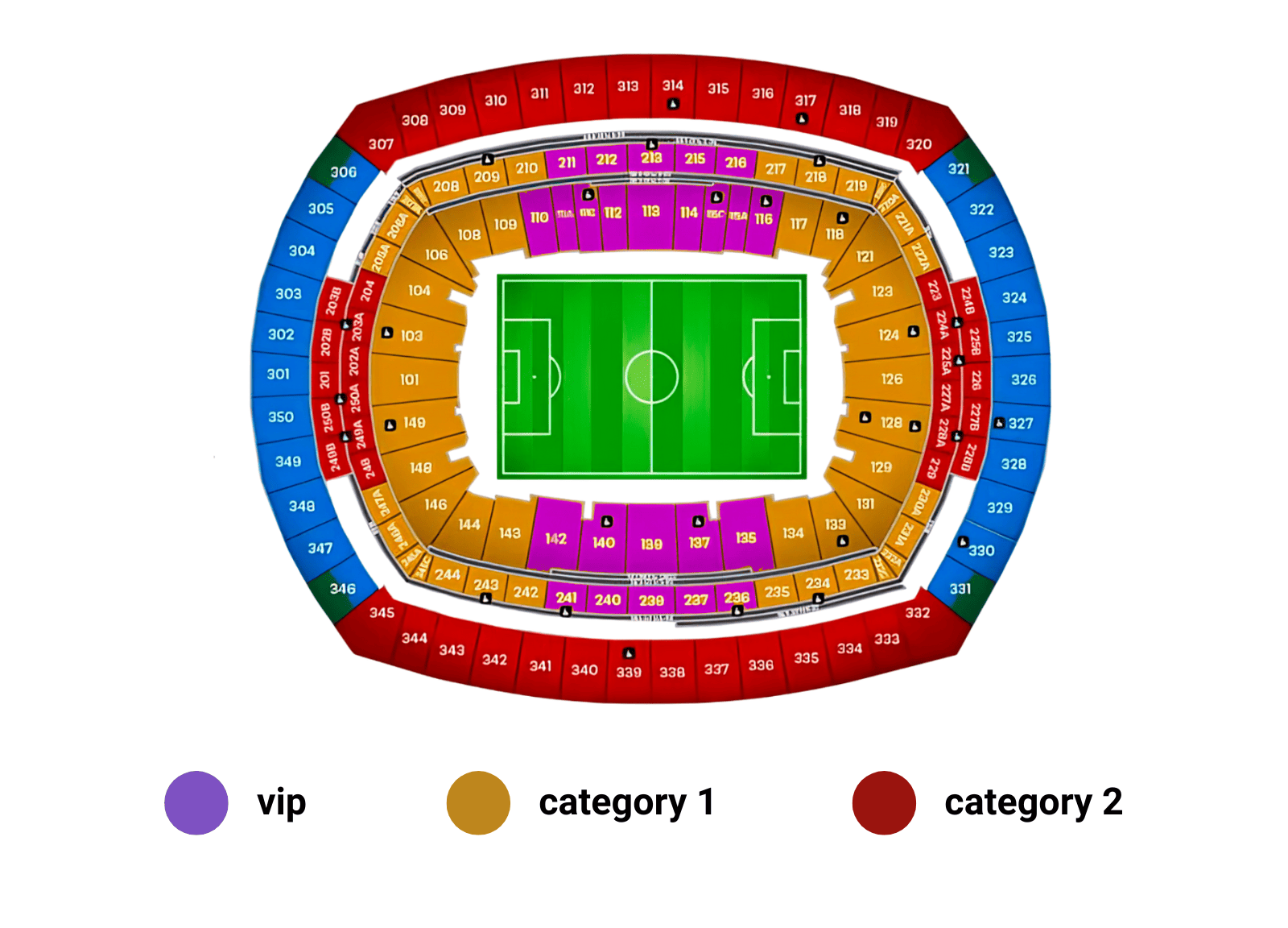 Com mais de 82 000 adeptos, o MetLife Stadium é um dos maiores recintos da América do Norte e o local da final do Campeonato do Mundo de 2026. Conhecido pelas suas excelentes linhas de visão, sistema de iluminação avançado e fácil acesso a partir da cidade de Nova Iorque e de Nova Jérsia, proporciona uma atmosfera de classe mundial em todos os jogos. *Os planos de lugares e a disposição das categorias são determinados pelos organizadores oficiais do evento. O esquema do estádio é apenas para referência e pode não refletir a configuração final do estádio.